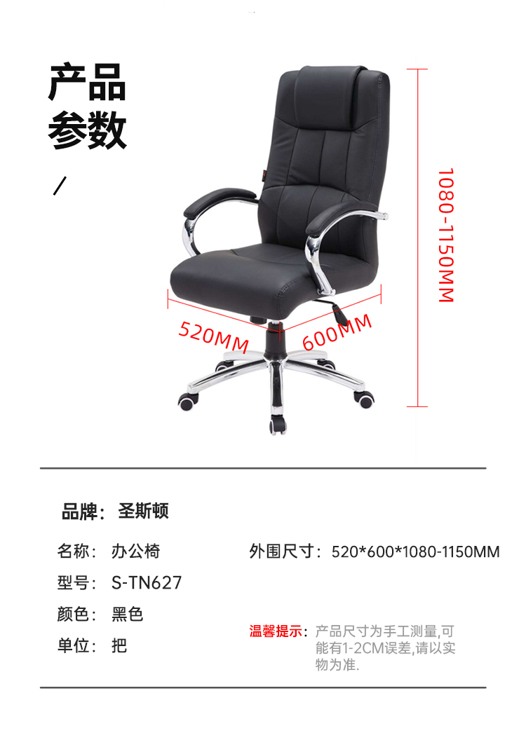商品标题:圣斯顿S-TN627西皮办公椅主管椅630*600*1080-1150mm(张)黑色