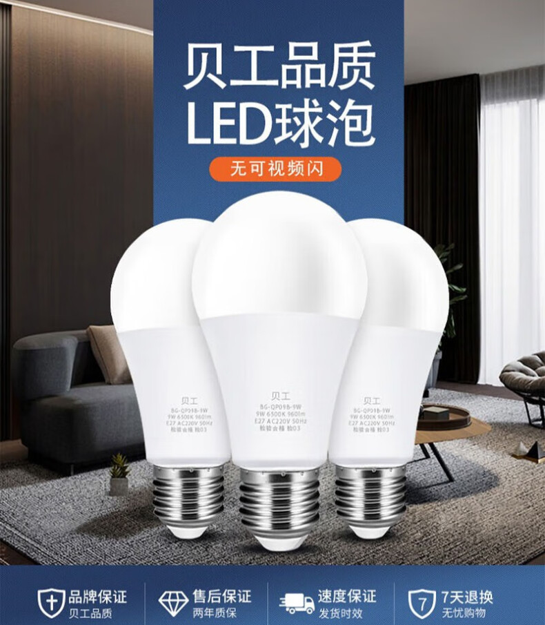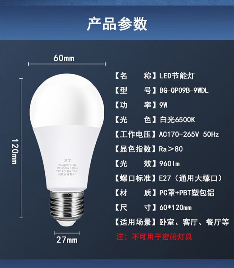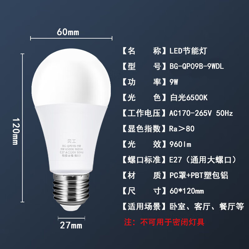 贝工 BG-QP09B-9WDL E27螺口 9瓦 白光球泡 LED节能灯泡(计价单位: 个 )