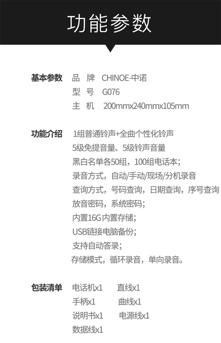 商品标题:中诺 G076 录音电话机 黑色 固定电话 (台)
