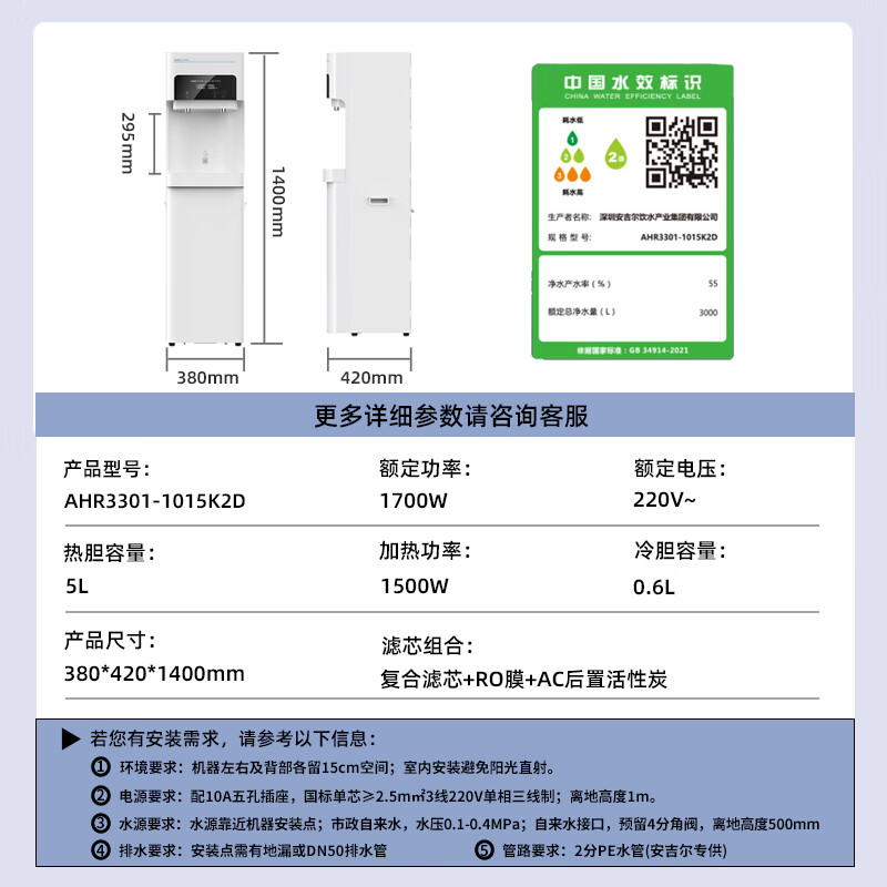 商品标题:安吉尔(Angel) AHR3301-1015K2D 商务反渗透净水器冰热款 (计价单位:台) 白色