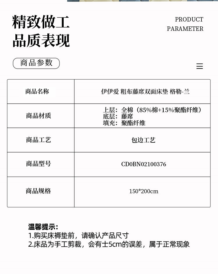 商品标题:伊伊爱CD0BN02100376粗布藤席双面床垫150*200cm*1格勒-兰(单位:个)