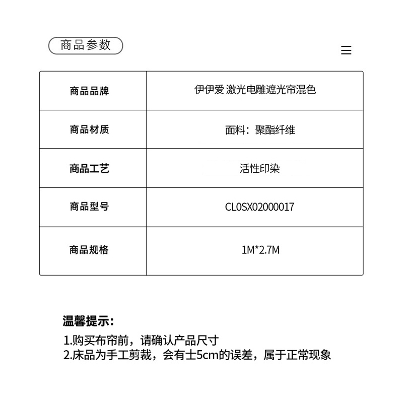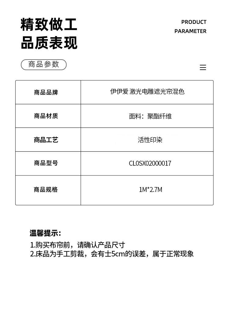 商品标题:伊伊爱CL0SX02000017激光电雕遮光帘混色1M*2.7M片(计价单位:片)配色