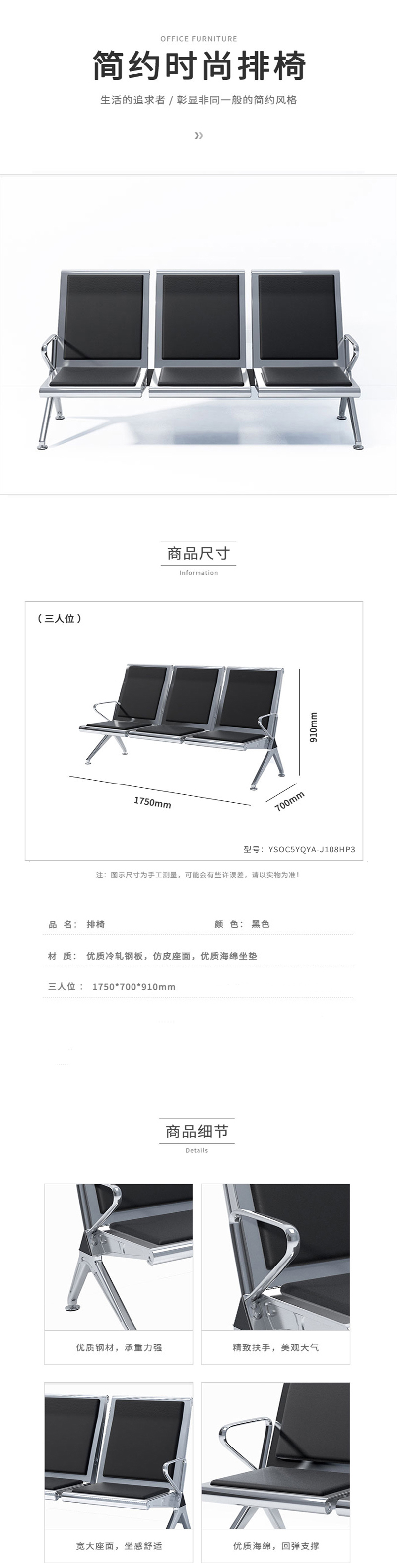 商品标题:悦山YSOC5YQYA-J108HP3等候椅三人位1750*700*910mm黑色(张)